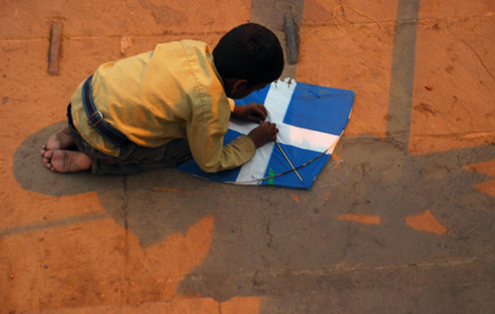 From the temple tower, I caught a glimpse of bright cloth being hung out to dry on rooftops, so after exiting, we walked down the street a bit to have a look. We entered a Moslem neighborhood filled with dye vats and washing tanks run mostly by children. At one point, a young girl went up on the roof of her house to spread out the dyed cloth. Against the sunlight, she created a ballet of veils, and I stayed for quite a while photographing her.