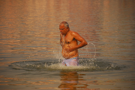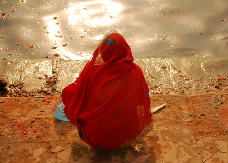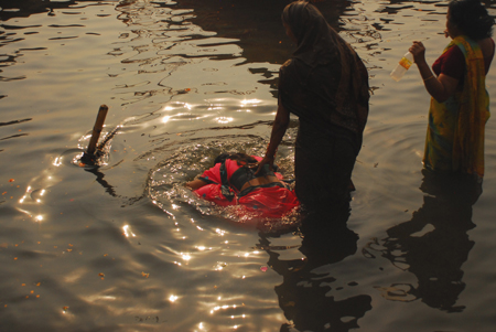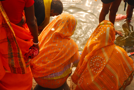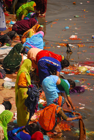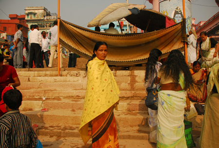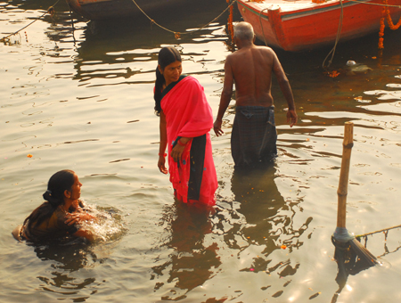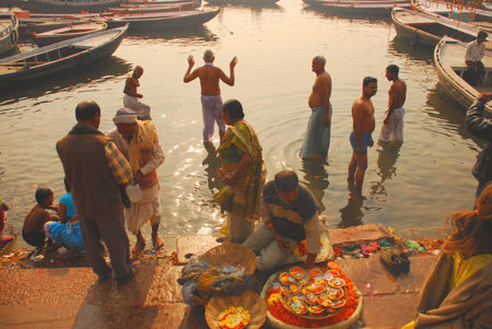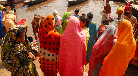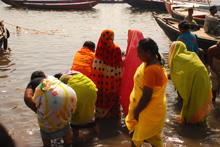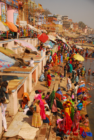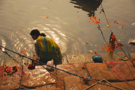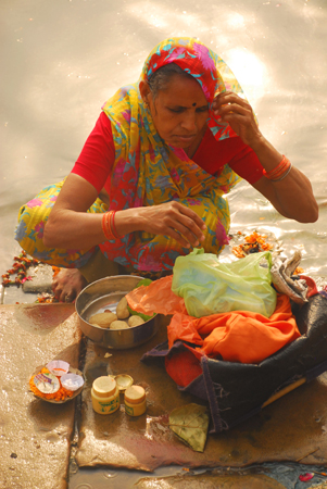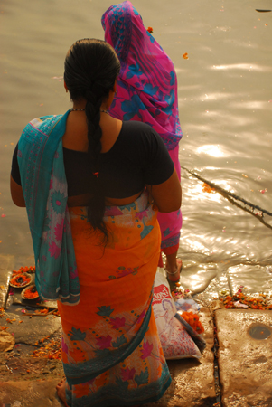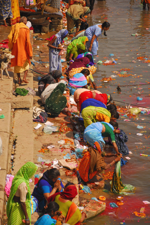 I preferred to concentrate on the women bathing in the Ganges. Having looked at so many photographs of Varanasi and the Ganges, I was anxious to see for myself. It is a brilliantly colorful sight along the ghats, full of activity and a constantly changing palette of bright colors. We had no problems taking photos. I walked back and forth several times photographing women preparing with oils and flowers, women at the water’s edge (with morning light reflecting off the river) women fully immersing themselves, drying afterwards etc. I observed great reverence but also great happiness; everyone seemed to be in a good mood. Although all are engaged in the same ritual, they do it individually, creating endless motion and great variety. A great show, and all I had hoped for, interesting choreography and a riot of color. This is one place that the disorder of Indian life is a plus – at least for the photographer.