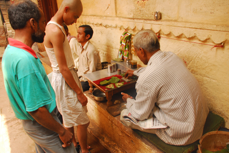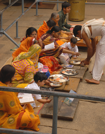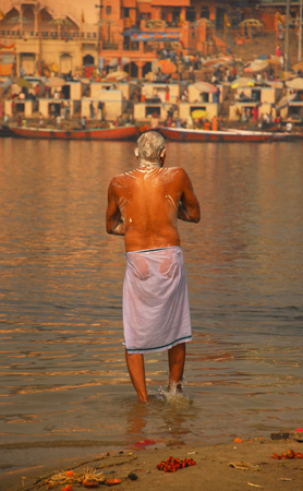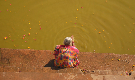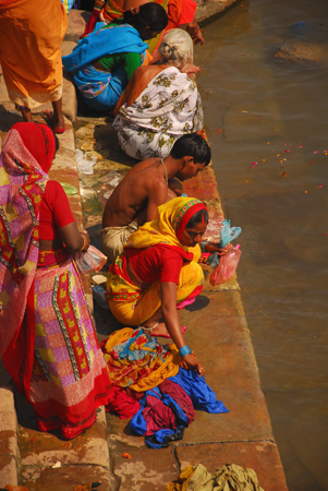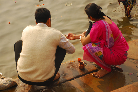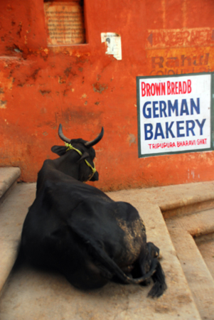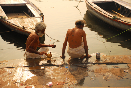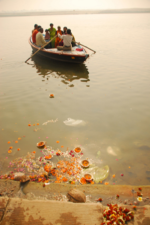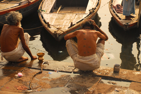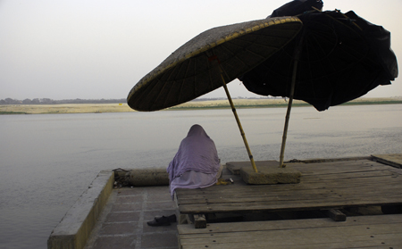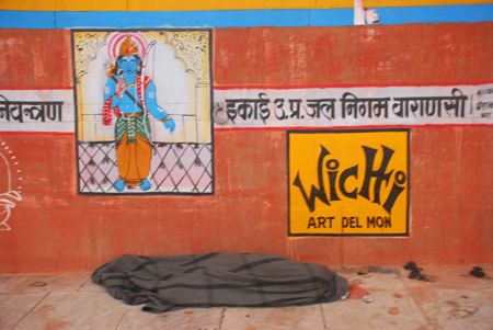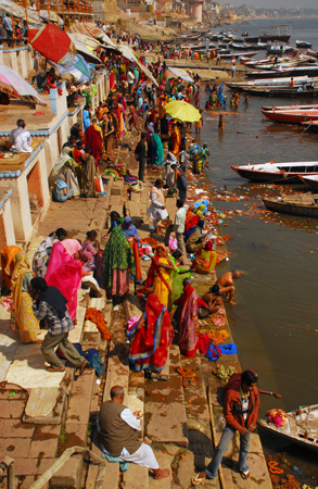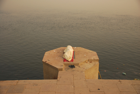 We arrived in Varanasi late afternoon and immediately began negotiations outside the train station to get to our hotel (the Rashmi Guest House / Palace on the River). We learned that motorized vehicles were not allowed to go into that part of town, close to the river. So, after much haggling and discussion we got into a motor rickshaw and were dropped off on a busy street corner. That was the abrupt end of the ride, and we had no idea where we were. After 10 or 15 minutes of wondering and waiting, we were collected by hotel porters sent to fetch us. We entered a shit-laden alley so narrow and crowded that the porters could not carry our bags by hand; they had to put them on their heads in order to get through. But once we reached the hotel which was right on the river, we no longer had to deal with the chaos of the town, only the chaos of the river and the ghats that line it. It’s a separate world, what we had come to see. The hotel was fine; because of a booking mix up, instead of the double room we had requested, we negotiated two separate rooms at the reduced rate of $42 each. We ate all our meals – breakfast, lunch and dinner - on the rooftop restaurant of the hotel which overlooked the broad panorama of the river. That way we could concentrate on photography and not worry about anything else.