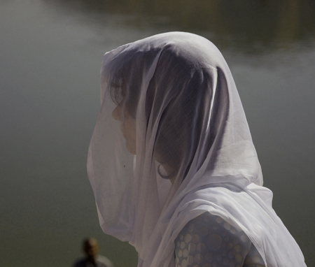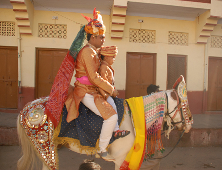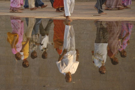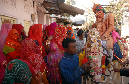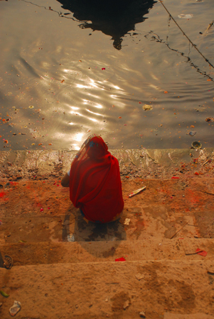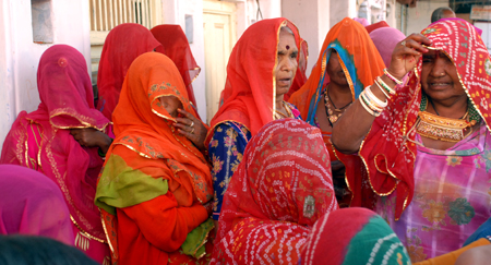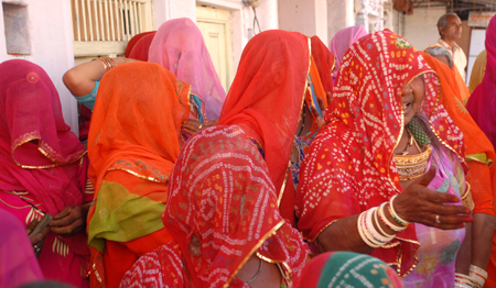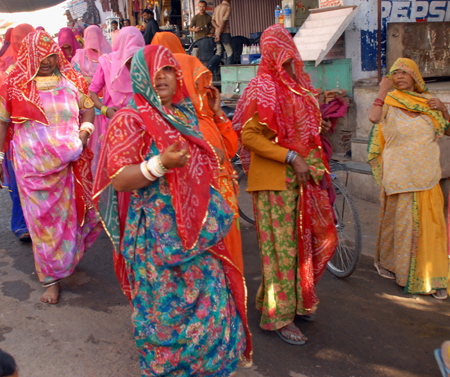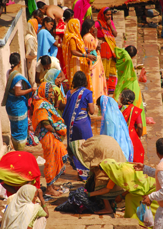 As soon as we got into town, we ran into a wedding - not the actual wedding but the preliminary tour of the town’s holy shrines by the groom (accompanied by a small boy) on horseback preceded by a brass band a retinue of brightly saried women and a small crowd all proceeding through the streets. We jumped out and followed along. Pushkar turned out to be a pretty and placid town surrounding a spring-fed lake. There are shrines all around the lake with people bathing and worshiping in a 360 degree circle. More relaxed and much smaller than Varanasi, Pushkar offered lots of opportunities to photograph the women. I continue to prefer the mystery and ambiguity of photographs from behind rather than the specificity of individual faces.