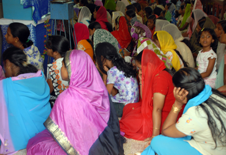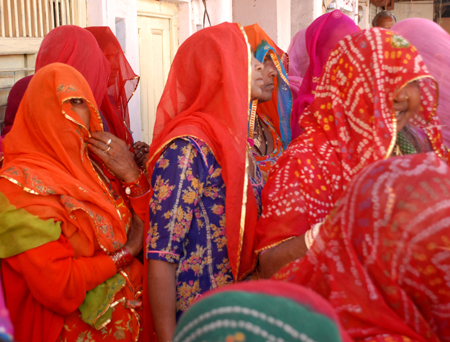 The next day after breakfast, I returned to the fort. The first thing I came upon was a little girl on a high wire doing the same tricks over and over again, expressionless like a trained monkey closely watched by her father who collected the money. I wondered what kind of life this girl had; doing the same routine without variation every day for hours. Serfdom. I accepted the proposition of a guide, a young student, and went with him into the fort / town. Fifteen buses of Jain pilgrims had just arrived, so the place was full of people all dressed in white. This was the first time I had seen Indian tourists behaving like Chinese tourists, traveling in groups. They were having a good time. When the crowd dissipated, I went into the elaborately carved temple. Then, I went around the town and up to the ramparts to get a view. My guide said there was a really good haveli in town worth seeing, so I accompanied him out of the fort into town to see what turned out to be three or four havelis side by side. One was open to tourists. We climbed up four flights past floors of empty rooms to the roof. Later I returned on my own and wandering around I was able to photograph street scenes including a group of women holding some kind of meeting.