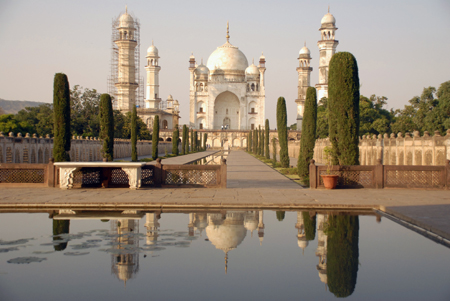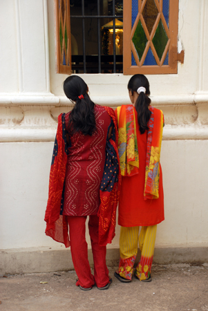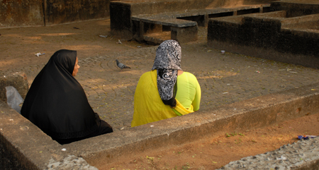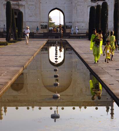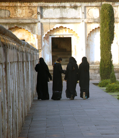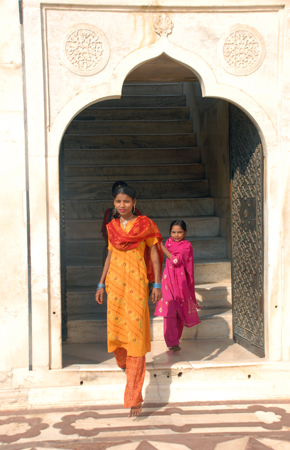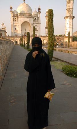 One afternoon, we directed our driver to take us to what is termed the mini-Taj, another mausoleum with the same general design as the Taj Mahal but without the inlay and fine detail. It’s called Bibi-ka-Maqbara and was built for the empress of Aurangzeb by his son, the grandson of Shah Jahan who built the Taj, in sort of a filial emulation. It was quiet and contemplative and very beautiful. The scale is intimate. Families were posing for photos and walking along the elongated reflecting pond. At one point, I encountered a group of Moslem teen-age girls, all covered in black, laughing and giggling (like any teen-age girls) making jokes (I thought) about my shorts. So I asked them if I could take their picture, and the others pushed one out for me to photograph, then went on down the path laughing and joking.