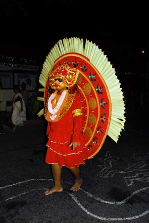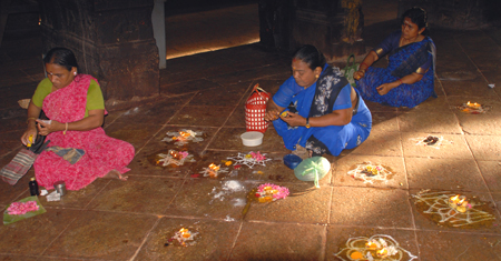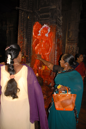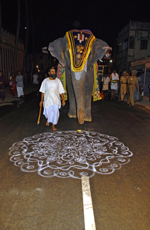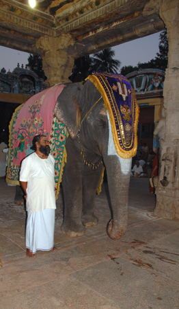 Then, as it began to get dark, we could sense that something was in the wind; people were lining up in expectation of something. We waited, and after a while an elephant with a beautiful robe was brought out. And sure enough, a procession began – with drums and high-pitched flutes, fire, singers, dancers, priests and acolytes. And us. Despite our sore feet, we followed the procession for about two hours, moving with them past throngs crowding the inner roads of the temple, past women prostrating themselves on the pavement. It was all sort of a blur. I should point out that all the steps of the temples are granite; the streets inside are like city streets, asphalt.