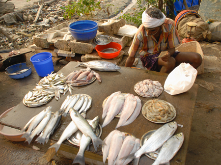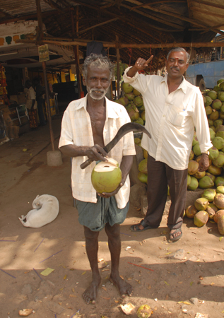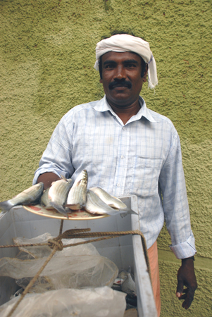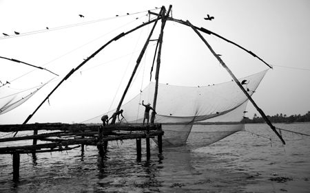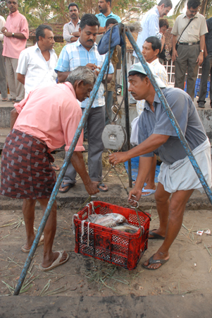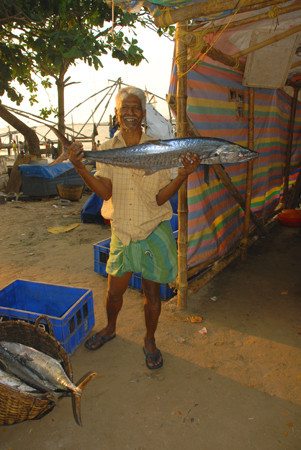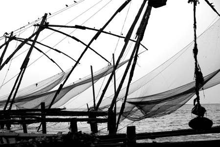 We walked along the shore promenade and photographed the old Dutch cemetery – they were here too. Pausing for a coconut drink under the shade of one of the large trees, we fell into conversation about Indian religion and politics with a young guy on a motor bike. Luckily we can walk from the hotel to the waterfront where they bring in the fish and where the Chinese fishing nets operate. (The Chinese were here too.) These are remarkable contraptions with large square nets that are dropped into the water from shore by a series of ropes and rocks to weight the boom. Normally they are left in the water for hours, but for the tourists, they operate continually, pulling up almost nothing every five minutes. But it’s a good show.