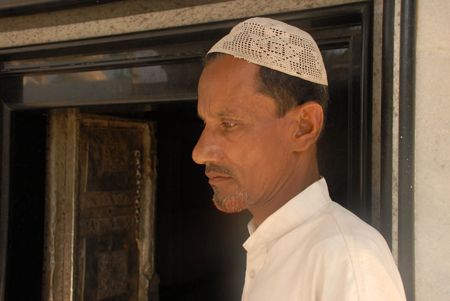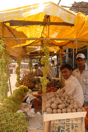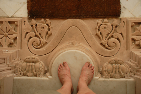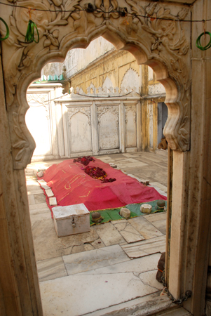 The guards at the entrance to the tomb were very hospitable and helpful; the image of American-hating Muslims is certainly not true in India. They seem very much Indians first and Muslims second. They showed us where to leave our shoes, passed us through crowds and then the metal detectors and escorted us inside pointing out what was what. Inside the tomb complex (another city within a city) throngs of worshipers crowded in; there were musicians and singers, people being blessed with peacock whisks tapped on their heads , shoving, pushing, chanting, praying. Because of a bombing several months ago, we were not allowed to take in cameras, so we took turns going in. There was constant, intense activity and worship. I saw a man with a small digital camera, and I tried to tell that to the guide without actually pointing out the man, but my guide simply denied the possibility – although he did allow that cell phone cameras would be o.k.