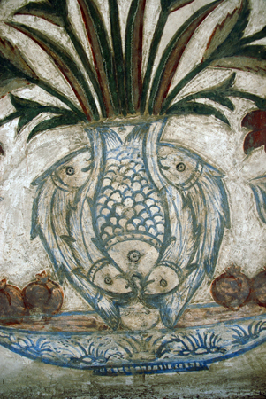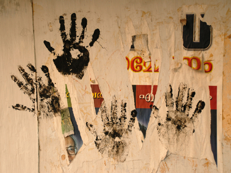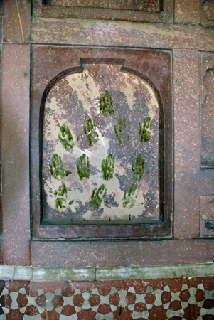 We also spent a pleasant hour or two at another Mughal tomb, Itimad-ud-Daulah, another mini-Taj, (like the Venice of such and such) not as elaborate, sandstone rather than white marble, but far more accessible. It had a promenade overlooking the river and buildings set around a large open yard. Inside there were a series of small rooms with inlaid tiles still in good shape. We found a series of handprints done with green dye, modern I’m sure, probably done by some of the youths hanging around the river.