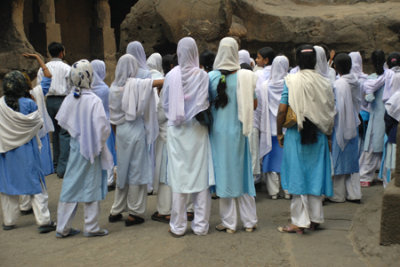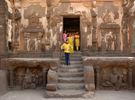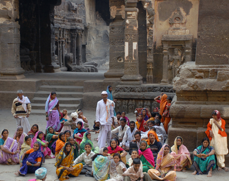 Going in and out of these caves requires a lot of walking in direct sun, but the caves themselves are quite cool and offer respite from the heat. The caves at Ajanta are Buddhist; at Ellora they are Hindu, Buddhist and Jain. I must say I can’t tell the difference. The carvings and paintings at Ajanta are not in great condition, and restoration has been fitful at best. These caves lay idle for years, decades, centuries, - who knows? - until an Englishman hunting a tiger in 1890 literally stumbled on them. It’s hard to imagine they were abandoned or ignored (probably not by the locals) but they are cut into hillsides, and evidently the vegetation just grew over the entrances. They are remarkable for the industry required to make them. Like the pyramids, it’s hard to imagine how and for what purpose they were created. Both Ajanta and Ellora were carved out of mountain sides – using mass labor for sure. Photographically, the caves are not so exciting. When I’m photographing, I’m less interested in the history of a place than I am in the forms and activity. It’s through the photography that I become interested in the culture; I do my reading after the fact. Drawn to color, I found myself photographing the people visiting the caves, including large groups of school children. There are around 30 caves in each locale, side by side in a great horseshoe arc facing a stream below. Why so many so similar? I don’t know. Probably because each generation – or ruler- felt the need to express its / his devotion.