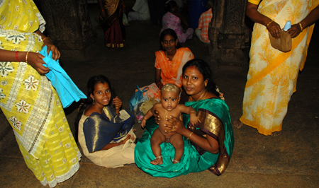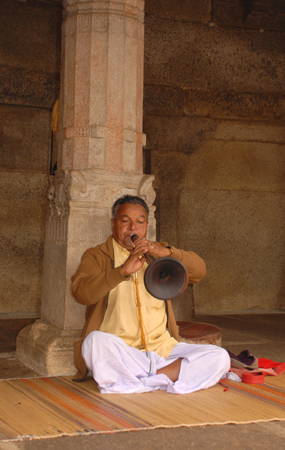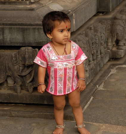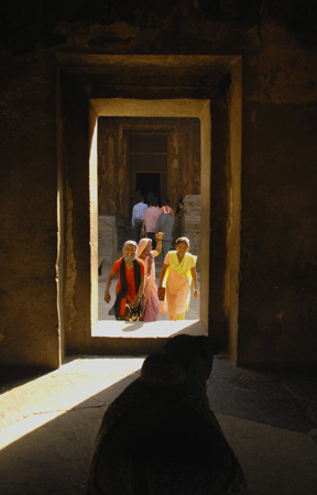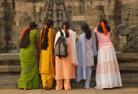 After Halebid, we went on to the next Hoysala temple of Belur where we found more of the same. Slightly smaller, more spread out, this temple too had friezes of thousands of figures. We could have benefited from guides at both places, but we contented ourselves with trying to make sense of what we saw by photographing. As usual, I was drawn more to the people than the monument; they stood out against the grey stone.