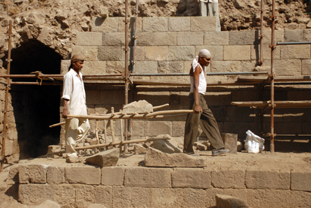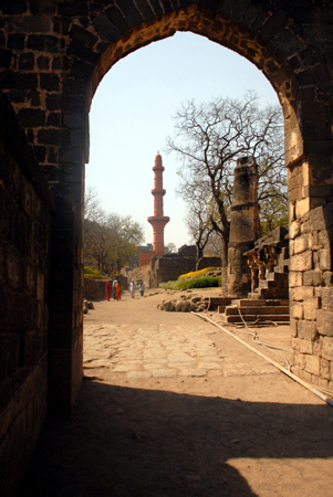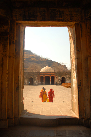 Near Ellora dominating a high mountain is the C11 fort of Daulatabad. Even though neither of us wanted to climb the mountain, we decided to stop and look around. The entrance is through a series of large gates. Inside we found stone workers building a wall, chiseling huge stones by hand and carrying them up to the wall with what looked like a stretcher. It was like lurching back in time several centuries. All construction is done by mass labor rather than machine; we have not seen a single crane or concrete mixer on our entire trip (except near the Delhi airport). Contrast this with China where scores of cranes dot every city landscape.