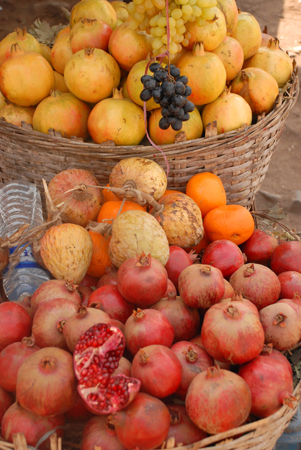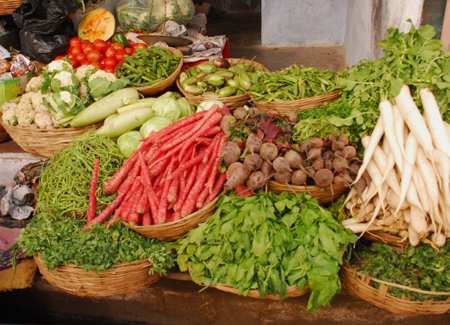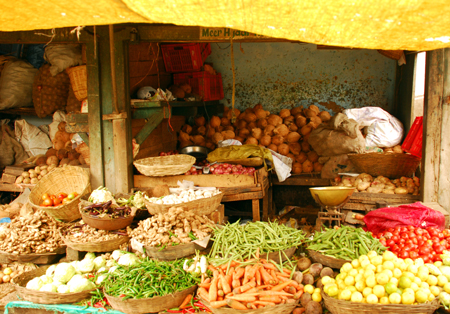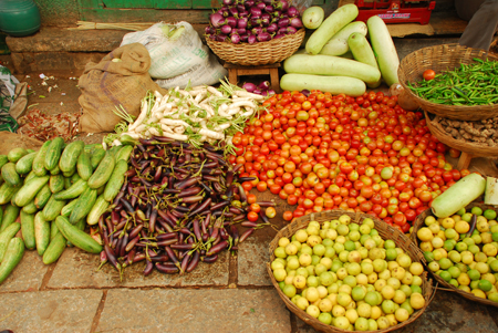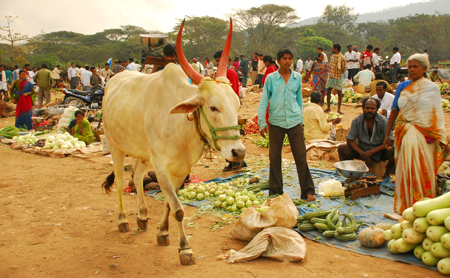 Today (Sunday) we took a rickshaw (motor bike with rear seat) to see the town of Mysore. We were amazed to come upon yellow cows (dyed for some festival) wandering the streets. We went first to a market, just a field where women spread out their vegetables on cloths. Cows had free reign here too, stopping to nibble the goods until women shooed them away.