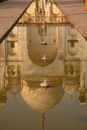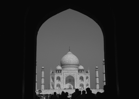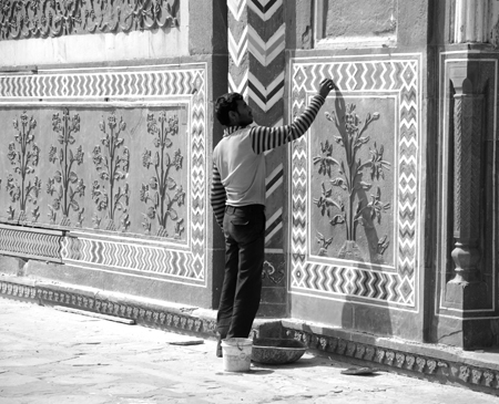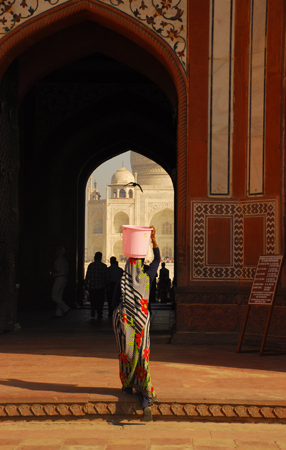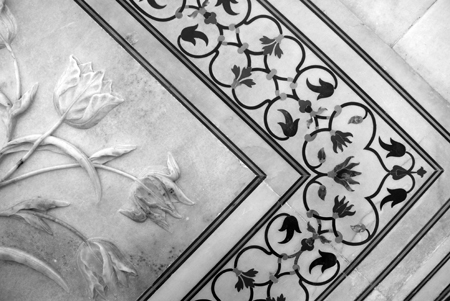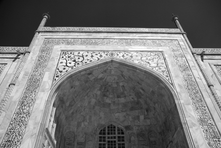 The Taj is truly remarkable and beautiful. Overwhelming. I wasn't sure how to deal with it photographically – the photographic history of it is so intimidating - so I mainly walked around and admired the wonderful architecture. The interior, where all the jeweled inlay is concentrated, is kept very dark, so you could only look at the inlay by flashlight through a metal screen. Not very satisfying photographically or otherwise. It was jam-packed inside, and noisy too, given the acoustics which amplify every sound. I exited quickly and spent my time walking around the outside and to the flanking buildings to the left and right. The scale and proportions are really wonderful.