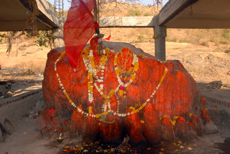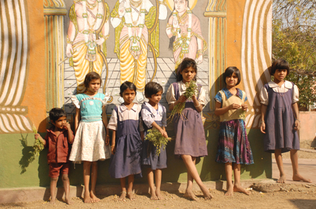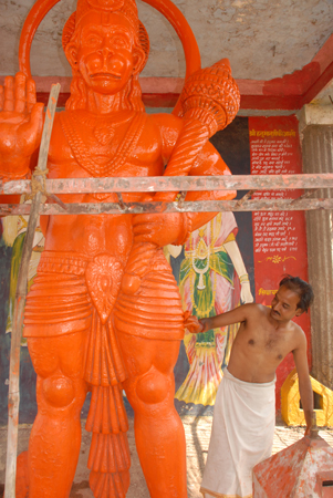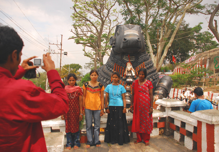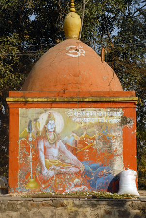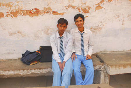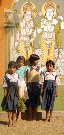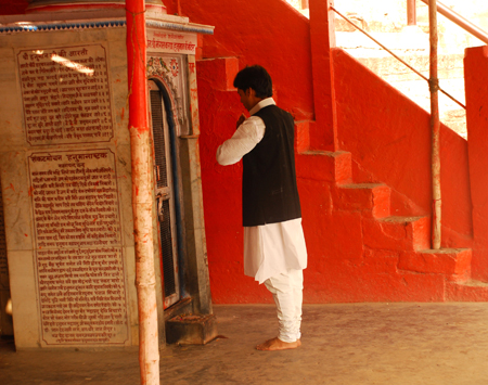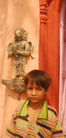 We have our driver used to our stopping along the road when we see something we want to photograph – today a Hanuman shrine on top of a small hill set back off the road. We climbed up to find a man covering the large statue with the characteristic bright orange paste. Sal negotiated with the priest for some pot but came up empty. Then, we came upon another shrine, this one with beautifully painted walls that caught our eye. When we stopped, we found we were in a small village with a flock of school children who all came out to greet us. They were excited yet reserved, watching our every move as we photographed them. It’s a trade-off of sorts; we take away photographs, they take away a memory of two strange men. I’m not sure which lasts longer or fades first.