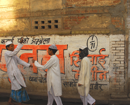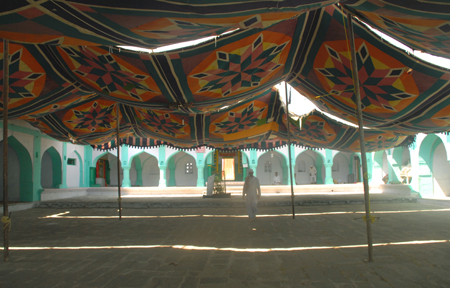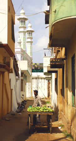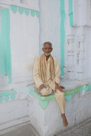 On our way out, we returned to Ajmer the next morning in part to thank the guards at the tomb for their graciousness and in part to get more photographs. Leaving our car at the gate, as we had the day before, we took two pedal rickshaws to the main gate of the shrine and had them wait. We photographed the entrance and all the people milling about. Some of the beggars were o.k. with photographs (for alms) some not. But I didn’t try. People were friendly, as usual, and several asked to have their pictures taken. Those who didn’t ask were nonetheless willing participants. |
