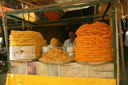 On our last night here, we went out to one of the best hotels in town (where we couldn’t get a room) to have a good all-you-can-eat buffet dinner. It’s a very elegant setting, and we plan to return tomorrow for lunch on our way to Jalgon for the train. |