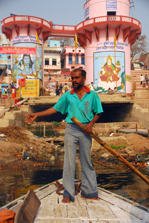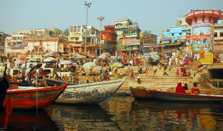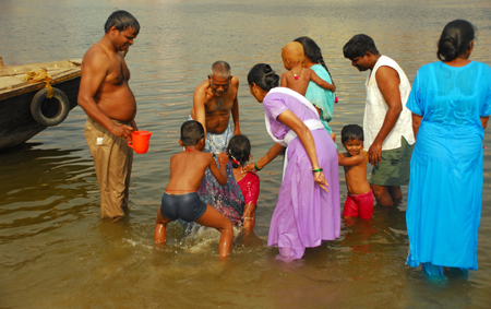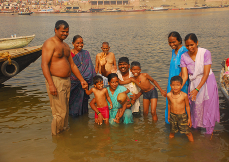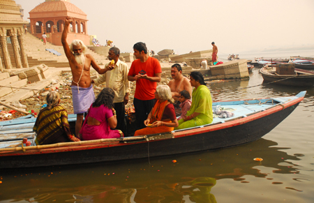 We took a boat across the river to the other side where families were also bathing in the river. The shore was just a sand bank seasonally visible during the current low water level. It was much more relaxed and less crowded than the ghats. Once again, I was struck by how good a time people were having in the river. Looking across the Ganges gave us a panorama of Varansi, the ghats and buildings spread along the river. On our return, we took the boat (one man rowing and poling) up and down the river along the ghats so as to get a view of all the activity from the water.