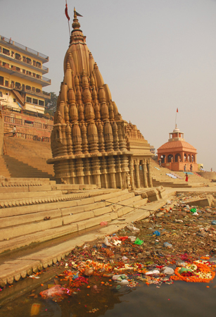 Our first venture out along the ghats brought us to the funeral pyres on the river bank where some 200 bodies are burned every day of the year. The cremation is a very ritualized process, and we were able to witness most of what goes on. Oddly, despite the rituals, there didn't seem to be much ceremony, nothing like a Western funeral or mourning, no gathering of family and friends etc. It was hard to pick out the relatives. For the Hindus, the Ganges is sacred, and this is the gateway to paradise. For me, it was a grim reminder of my own mortality. Visiting Varanasi may be better for younger people who aren’t as readily prompted to envision their own demise. And for a non-believer, it’s hard to visualize paradise in the smoky pyres and foul river. We didn't linger.