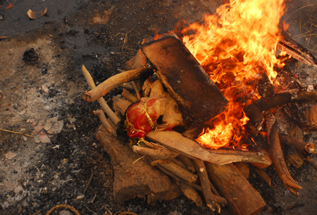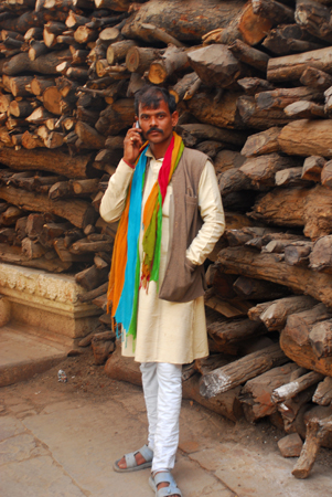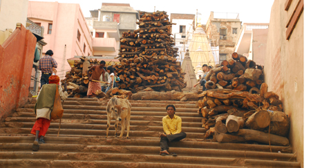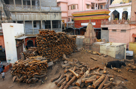 We wandered the back streets near the funeral ghats for a while looking at the life that ripples out from death, the peripheral activities of cremation; enormous piles of wood gathered for the fires, shrines, shops and street life. Here we were able to rid ourselves of the photo monitors; this was not their territory. |