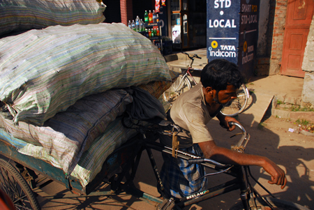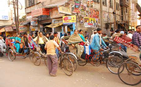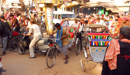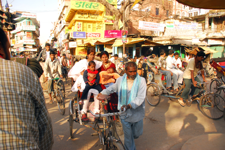 At one point, we decided to venture into town, to brave the congestion of street life away from the river, in order to visit two temples. We hired two bicycle rickshaws near the corner where we had originally been dropped off. (We had a hotel porter escort us through the warren of streets to the main street). We couldn’t enter one temple or photograph at the other, but the ride was interesting. In the rickshaw we are high enough to get a pretty good view of the bustling street activity.