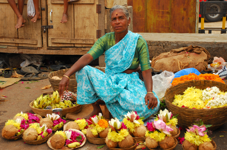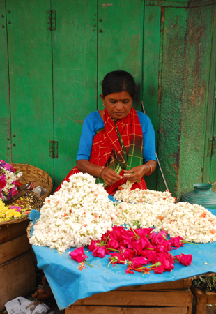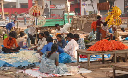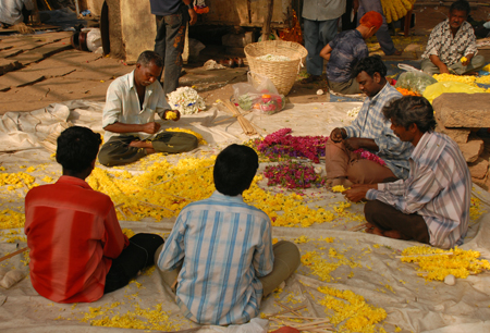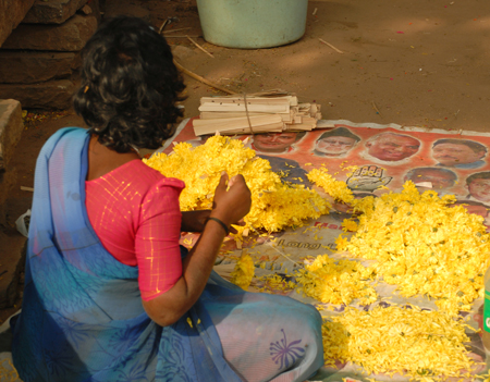 The next morning we went back out to the streets, this time with our cameras. (My first Indian photographs!) We retraced our steps of the previous day circling the hotel to keep our bearings and came upon a group of people in a small square stringing flowers for wreaths. Very colorful, and it took a while to recognize the poverty that lay behind the beauty of the garments and the garlands, to realize these people probably slept right where they were working. The radius of their lives probably did not extend far beyond this small patch of urban subsistence.