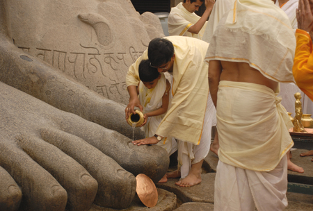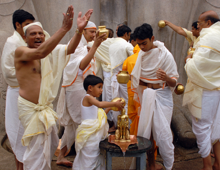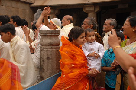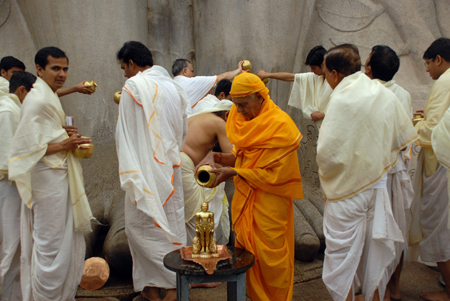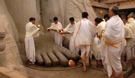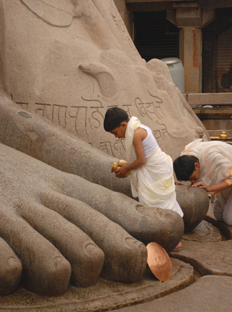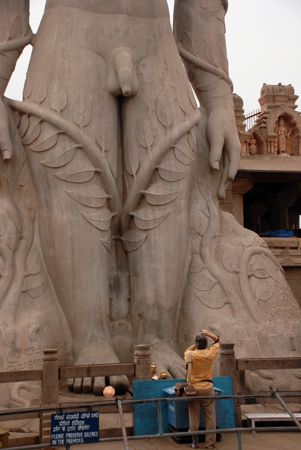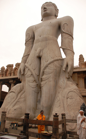 At the top of the mountain, we found a festival going on under the gaze of a huge 60 foot male nude statue (of Gomateshvara). What looked like a group of middle-age businessmen changed into white dhotis in order to worship. Some had their sons with them ‘on stage.’ Their wives and families were proudly photographing and videotaping them. It seemed to me more like a fraternity reunion than a truly serious worship; they were having far too good a time. There was music, washing and kissing of the statue’s feet (enormous toes the size of men). We took lots of photos; once again, no one seemed to mind. We intruded where we needed to intrude.