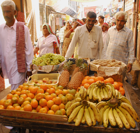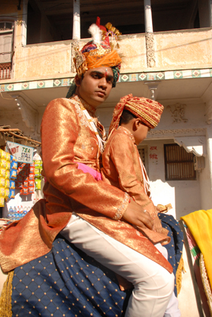 We went back to our hotel in Pushkar - very nice and comfortable - mid day and then went out to photograph the lake and its periphery in afternoon light. We ran into another wedding with another groom on horseback and another band of four or five horns playing (not necessarily together) four or five tunes. At the same time a sound cart blasted music on eight big horns at maximum decibels – ear splitting for anyone nearby. From the veranda of a rooftop restaurant we could look down on a small vegetable market spread out in an intersection. We had cold drinks and hung out watching the sun lower.