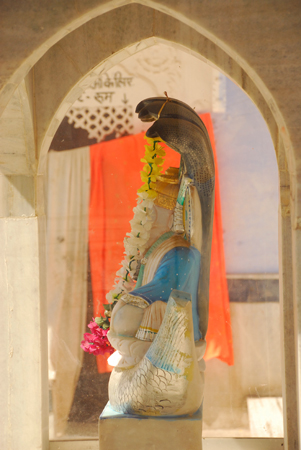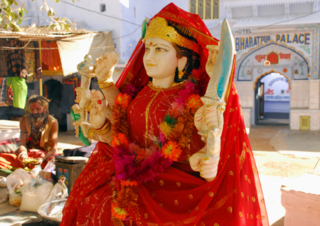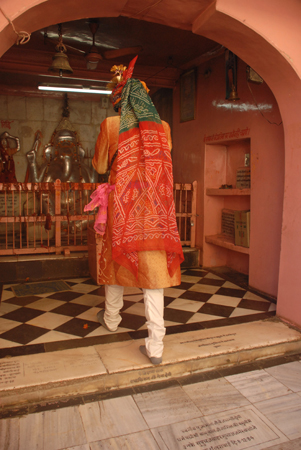 On the way to Bikaner, we passed a shrine that looked to me like a three dimensional comic book – but one which inspired devout worshipers. The entrance was through a larger than life-sized lion’s mouth, and inside the compound was an enormous pink Ganesh. They were still constructing the mountain backdrop. Outside, the lion was flanked by a statue of a giant four-armed figure holding a severed head. I confess I’m baffled at the meaning of all these Disney-like figures. But we witnessed several people come to pray with great seriousness, including a newly married couple. The bride followed the husband, attached by a sash over his right shoulder.