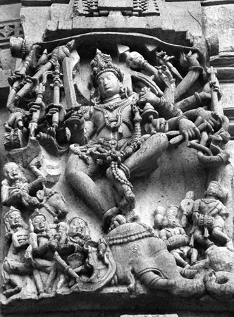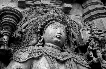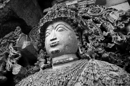 After we descended from Gomateshvara, we found our driver and took off to two other temples, these of the C11-13 Hoysala people. Both temples feature elaborate stone carvings. The first was Halebid, more linear than vertical with multiple friezes covering the exterior walls. The carvings are highly detailed with thousands of figures of deities, animals, rulers, mythical tales etc. The scale is vast, the figures intimate and repetitive. They were carved in blocks elsewhere (in some sort of primitive factory) and assembled on site. Why and by whom is still sketchy, I gather. More than I could really take in. I switched to black and white.