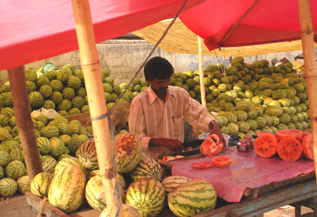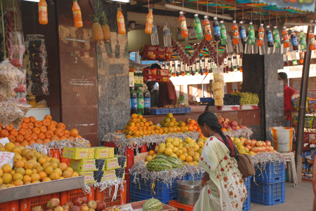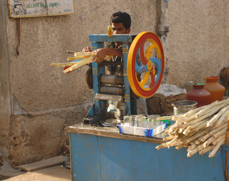 Given our problems in Trichy with finding a hotel, we decided to stay in Tanjore and ended up in a very good hotel (Hotel Gananam) the best so far. At one point, I decided to look for more cough drops to fight my lingering cold (from the train) and was directed to a pharmacy around the corner from our hotel. It was late at night, but the pharmacy, open to the street, was doing a booming business. I counted at least a dozen employees behind the counter and in the stacks above where the drugs were stored. One guy with a laptop entered all the orders fed to him by a bevy of clerks and generated the receipts. Another, next to him, manned the single cash register. There was no line; customers waved their prescriptions and called out to be waited on. Nor was there any discernable order to all the activity behind the counter. Yet, it all seemed to work; I was waited on without too much waiting, and lo and behold a receipt ended up in my hands, then the pills, all for about a buck. Once again, despite the shouting, there was no shoving or displays of temper; Indians seem pretty placid, certainly friendly to outsiders.We negotiated with Arun to take us all the way from Tanjore to Cochin, a two day trip. Considering there were few good East-West options in Southern India whether traveling by train or bus, we decided to stick with Arun. We were comfortable with him; he was a good driver, spoke pretty good English and was amenable to our frequent stops. But it turned into a long, slow trip. The temperature got hotter the further West we went, but it was a long way from stifling. Even without AC we were o.k. for most of the trip.
