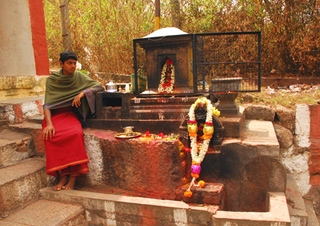 Then we took the rickshaw up to the temple on top of the hill overlooking the town. The top was crowded with school groups and throngs of pilgrims. We had to stand barefoot in a long line stretching around the temple in order to get in. Inside, the small spaces were jammed with people, but no one seems to get out of control, no pushing or shoving, no sense of claustrophobia. Photographing was difficult because of the crowds and the dim light.