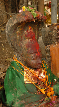 Then we came across another of the ubiquitous shrines along the road that are often so unusual. This one was in the form of a large abstract cat and was attended by a priest clad head to toe (ankle) in pink. Goats were running free all around the shrine; evidently they were regularly sacrificed there. We decided we hadn’t the time to take in a sacrifice, so we took pictures and went on our way. On the way out, kids crowded around the car, egged on by Salvatore, all shouting excitedly. To them, we were as exotic as the shrine was to us. |