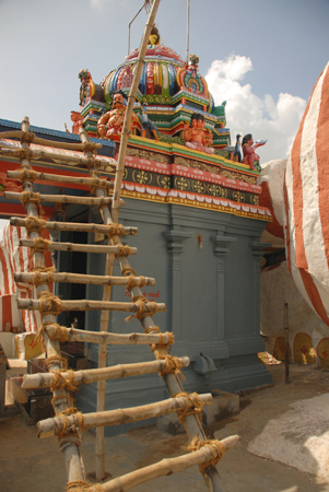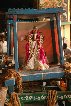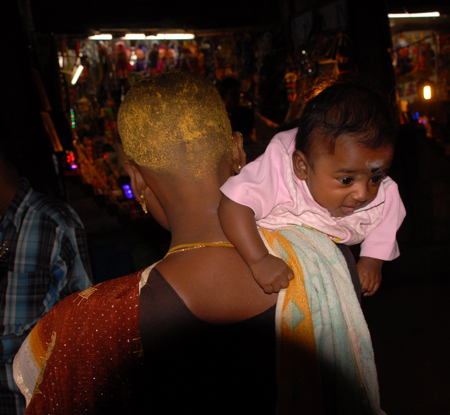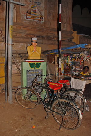 Surprisingly, we were accepted as part of the procession and guided along as we photographed. (Hardly anyone in India has protested our taking their photographs, and often we are begged to do so, sometimes for money but usually not). Despite the fervor of the religious worship on display, I was struck by what a good time people in the procession were having, laughing and joking as they - about 20 men - carried a huge palanquin mounted on top of long logs. They were sweating but enjoying themselves and even invited me to join them carrying. I declined, more interested in photographing than lifting. It was a great evening; we felt lucky to have stumbled on this. By the end, however, when we’d had enough and fell out of the procession, we had no idea of where we were, where we had left our shoes or where our driver was. We discovered we were at the opposite gate – the towers all look alike - and there were no motorbike rickshaws left inside. So we prevailed upon an old man with a bicycle rickshaw to take us to the other side of the temple where we were reunited with our shoes and driver.