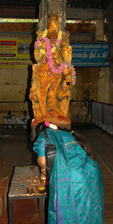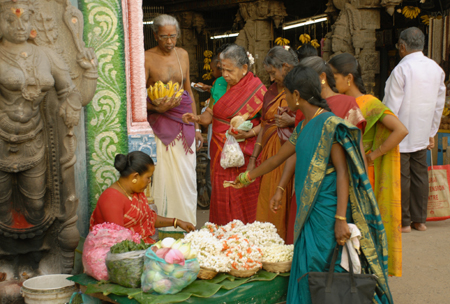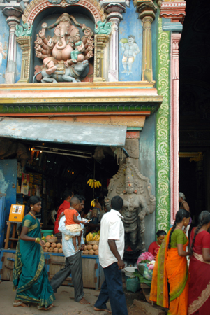 The temple in Madurai is quite remarkable. It has four enormous towers at the corners; within the compound are houses shrines, stables, shops, eating and sleeping facilities. These temples are really self-contained cities, and you can see how in the old days, all the life of a fort or temple went on within the walls. The variety of shrines seems endless; the most sacred don't allow non-Hindus to enter, but we had no problem photographing anything else. We spent several hours there and then took a break for lunch back at the hotel. Once again, we had to do the whole temple - acres ( 6 hectares, according to the guide book) - in our bare feet (no socks allowed this time) so after a while I was really hobbling. We had left our shoes in a shop and when retrieving them, fell into pleasant conversation with the young owner covering a gamut of history, religion, politics etc. We spent almost an hour there talking and ended up buying some jewelry (Sal) and pillow covers (me).