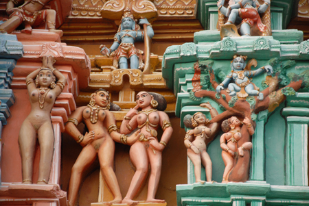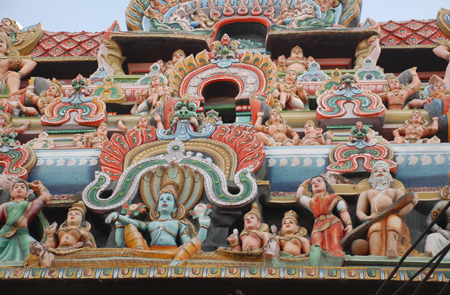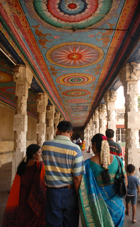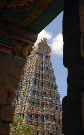Madurai was congested and not at all attractive; the hotel (Hotel Supreme which had been booked by our previous hotel) was on a typically crowded noisy and dusty city street; the lobby was dark and faintly ominous, our room plain and semi-functioning. But we both got hot showers (on different days). In general, we have been getting a shower every other day. After checking in, we had (non-veg) breakfast and then headed off on foot to see the temple - which is why we’re here.